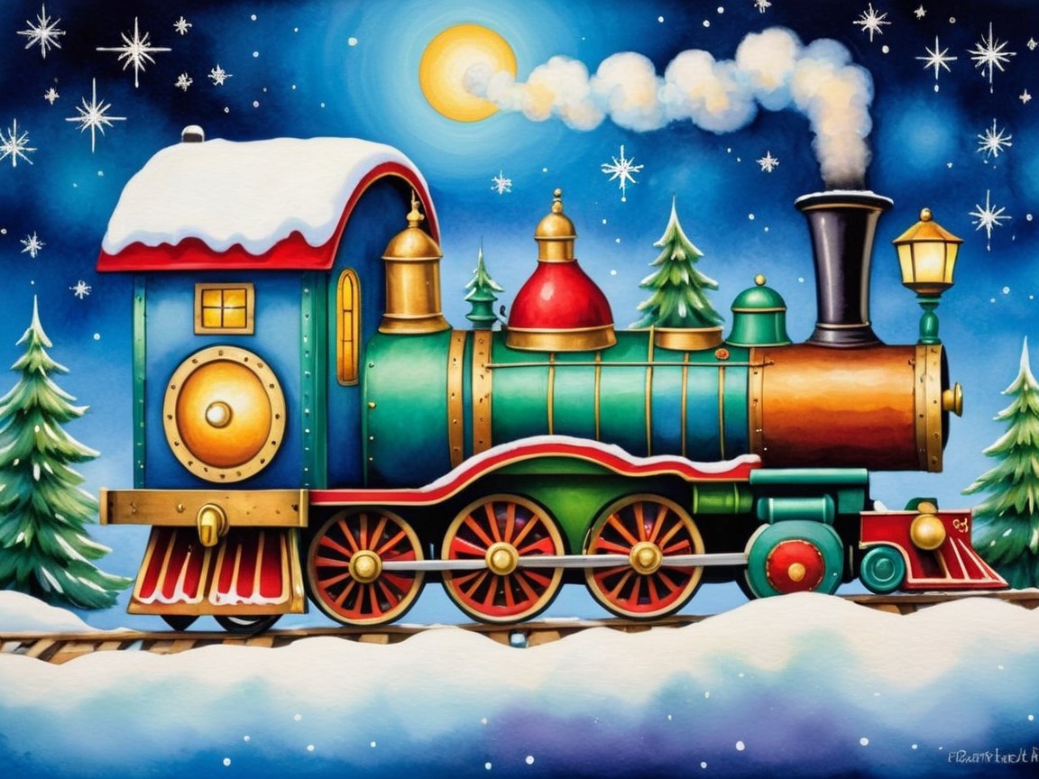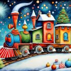 A vibrant painting of a festive Christmas train, side view, at night, traveling on snow-covered tracks. The train is a steam locomotive painted in bright blues, reds, greens, and gold, with white snow piled on top of the caboose. It has gold accents, including a bell,