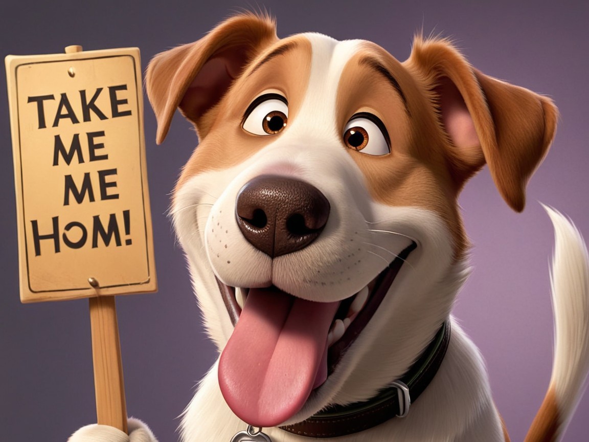 A cheerful cartoon dog smiles widely, holding a sign that reads "TAKE ME HOME." Its playful expression and wagging tail convey a sense of friendliness and eagerness for adoption.