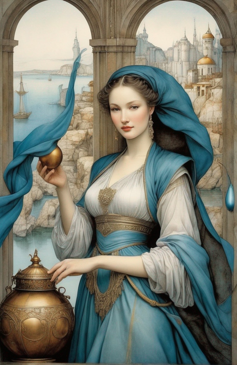 An elegant woman in historical attire holds a golden orb and scepter, standing by a balustrade overlooking a coastal town.
