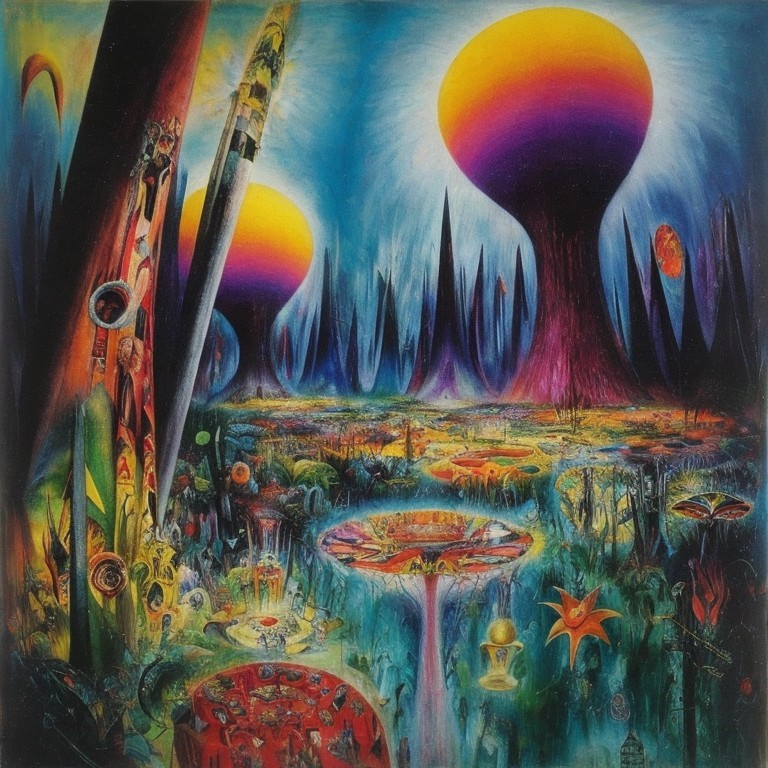 Surreal Landscape with Oversized Mushrooms and Vegetation