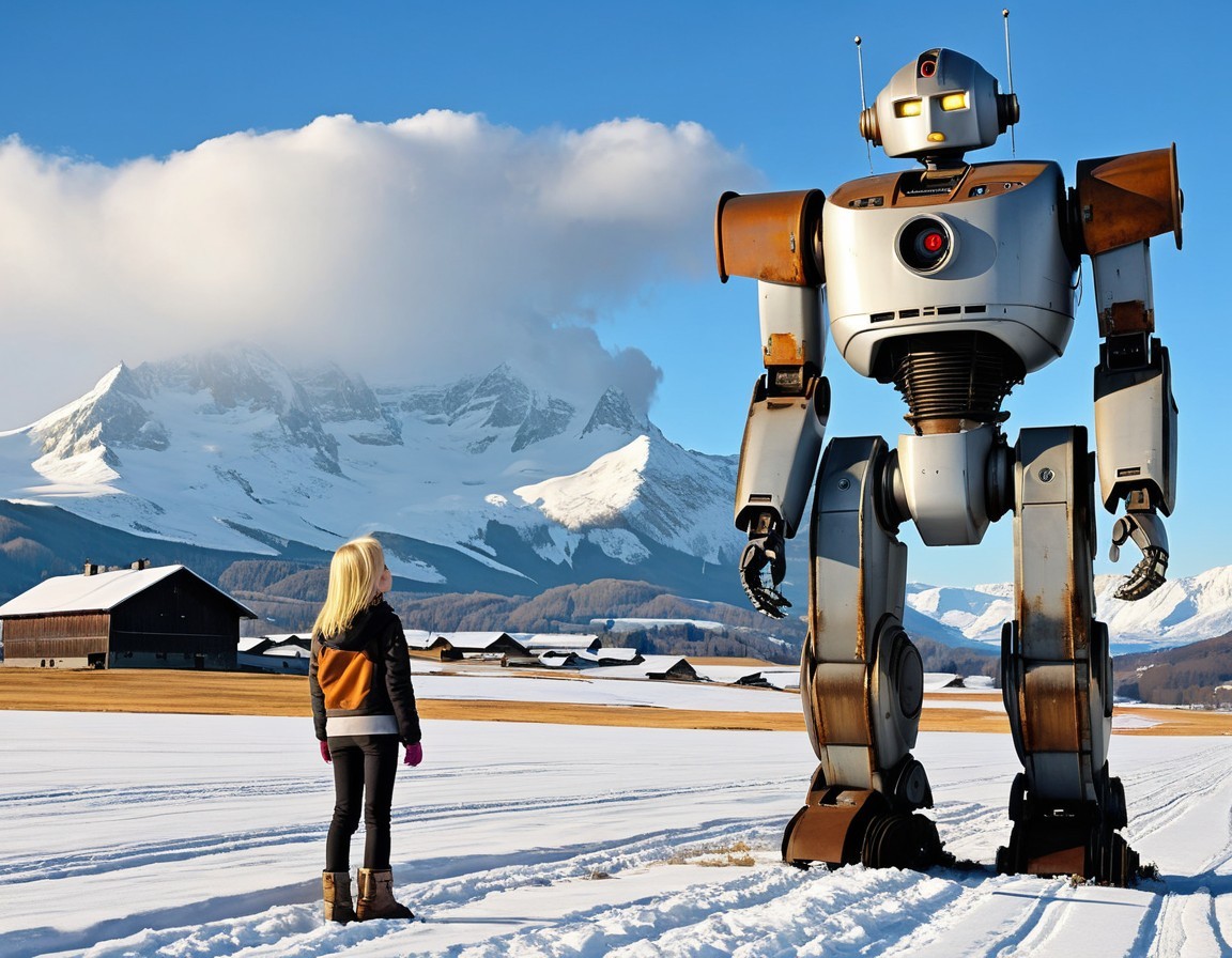 In a serene Swiss prairie under the morning sun, a massive 500-ton, 300-foot tall robot stands, showing signs of wear in gray and white hues. Snowy mountains loom in the background as a small blonde girl interacts with the towering machine.