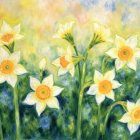 A vibrant watercolor depiction of blossoming daffodils, showcasing bright yellow blooms against a soft, pastel background of green grass and gentle sunlight filtering through trees.
