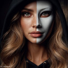 The image features a striking model with long hair, wearing a silver face mask and hoodie. Her captivating eyes draw attention, enhanced by dramatic lighting and a minimalist backdrop.