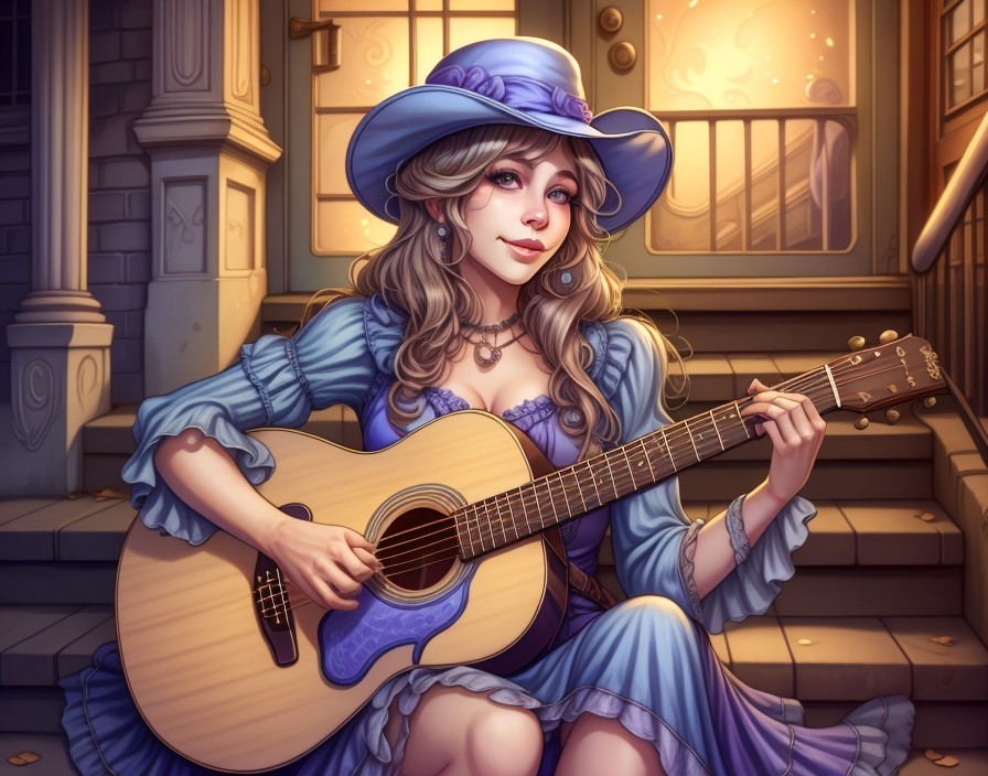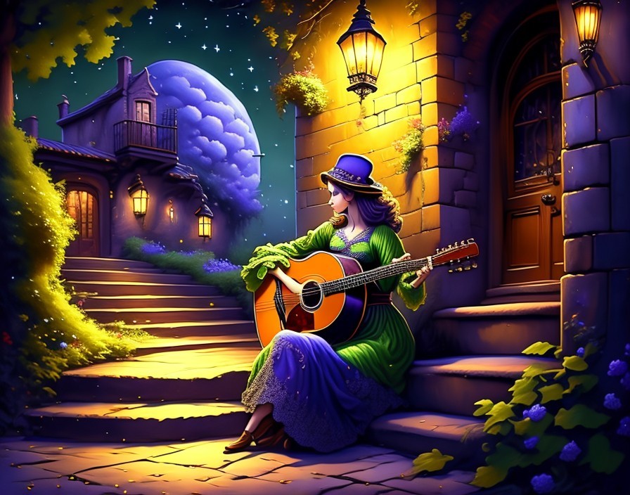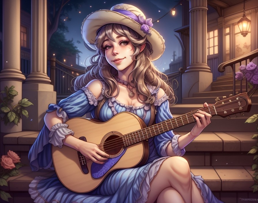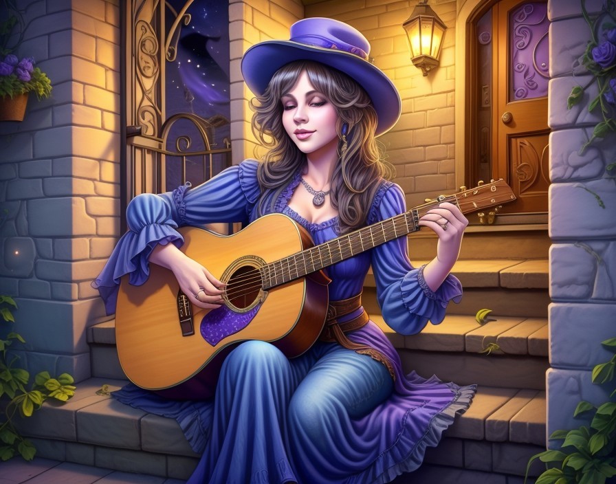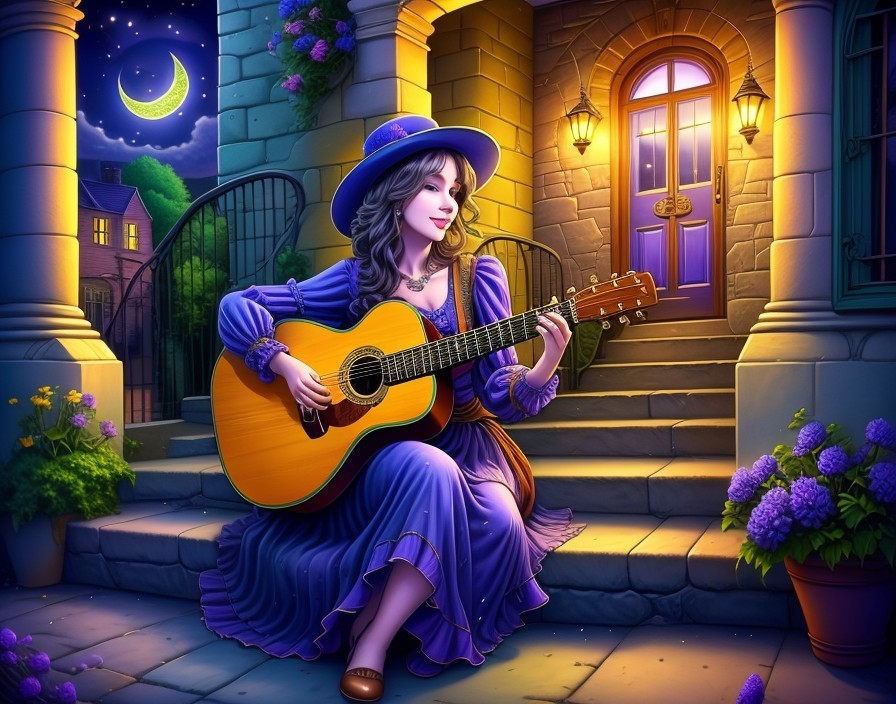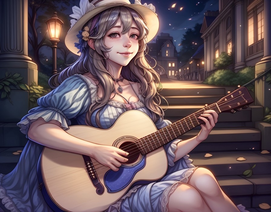 A smiling girl with a hat plays guitar on stair steps at twilight, surrounded by lit candles.