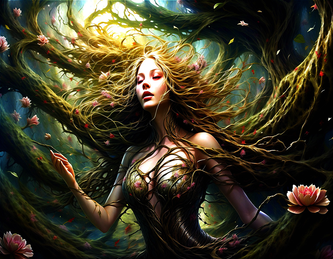 A mystical figure with flowing hair intertwined with vines and flowers, surrounded by a lush, enchanting forest. Ethereal light filters through, creating a magical, serene atmosphere.