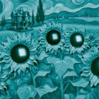 A vibrant, surreal landscape features oversized blue sunflowers in the foreground, with two charming houses and rolling hills in a dreamy green-blue palette under a stylized sun.