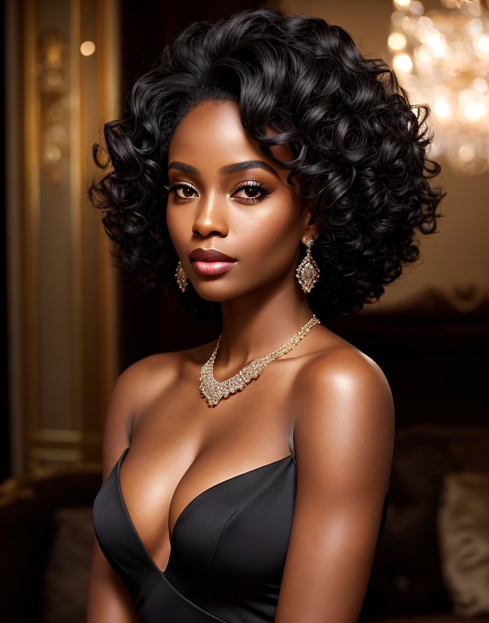 Elegant woman with curly hair, glamorous makeup, and a black dress, adorned with a sparkling necklace, in a luxurious setting.