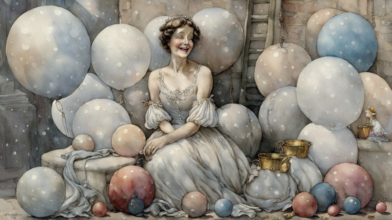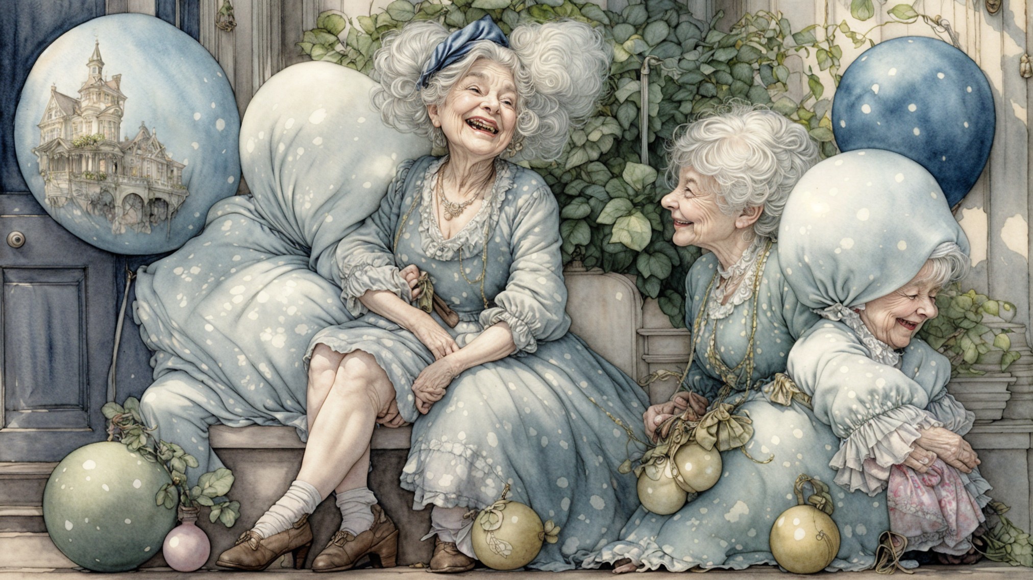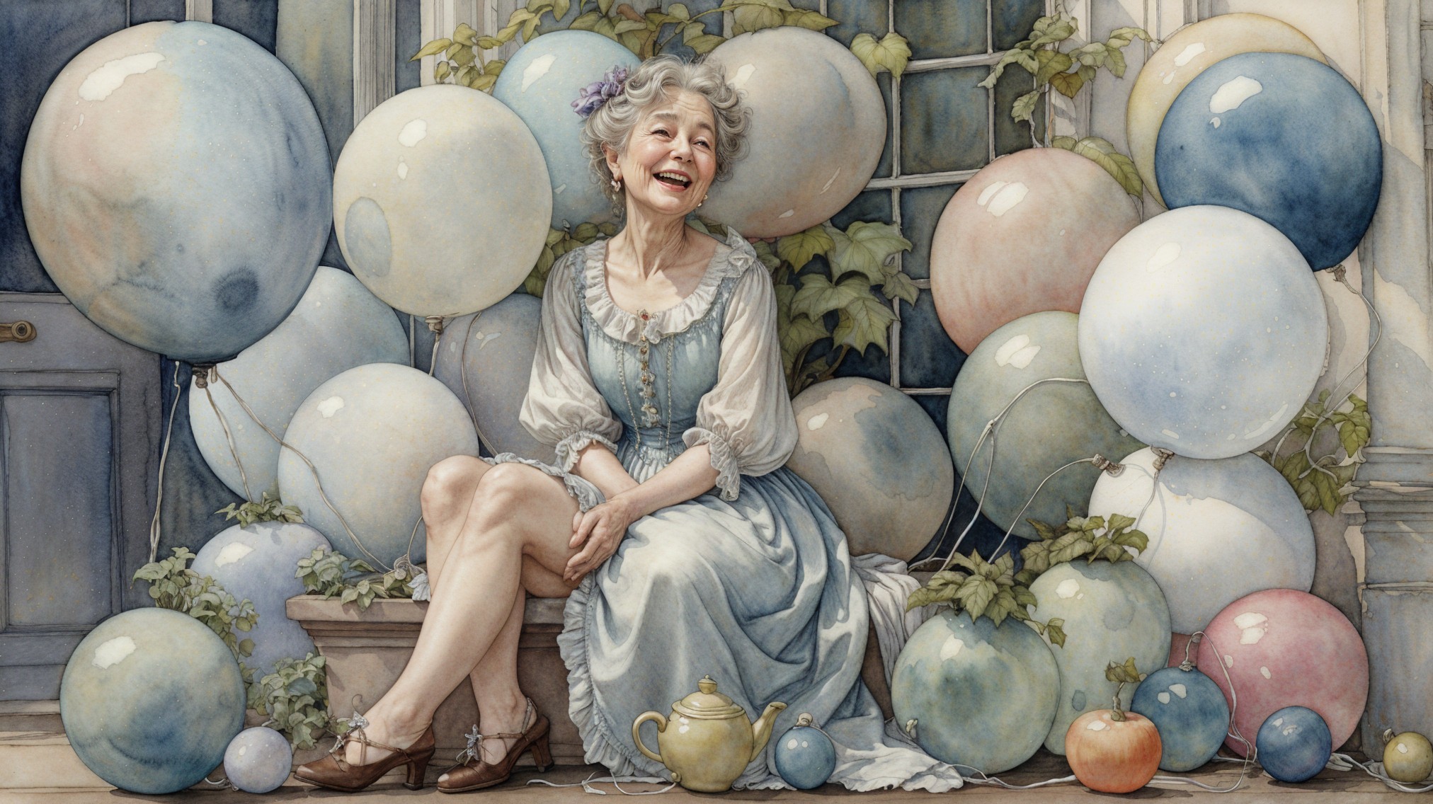 A cheerful elderly woman with curly gray hair sits happily among pastel balloons and potted flowers, wearing a light blue dress and radiating warmth and joy in a charming garden setting.