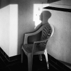A brightly lit room features warm orange walls and a single white plastic chair. Light casts a shadow on the floor, creating a cozy, inviting atmosphere with a touch of minimalist decor.
