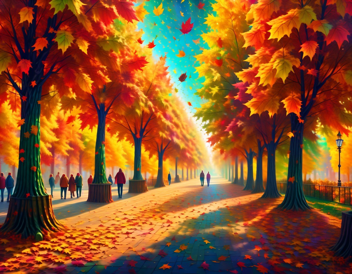 A couple walks hand in hand through a scenic autumn path, surrounded by vibrant orange and yellow leaves. Soft sunlight filters through trees, creating a warm, romantic atmosphere.