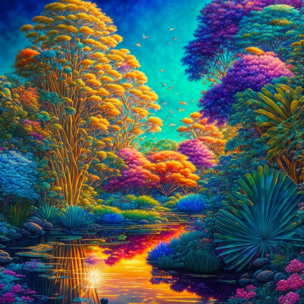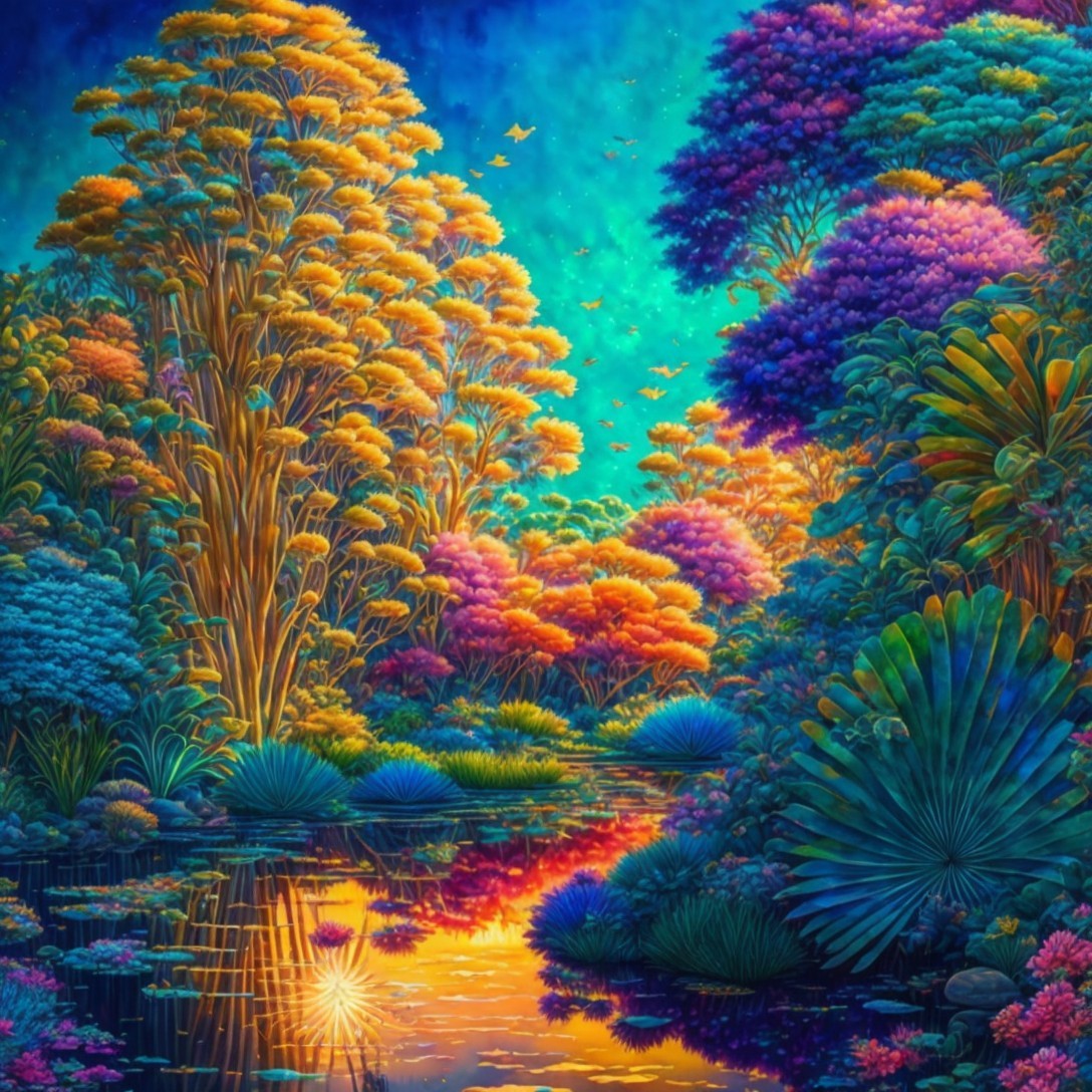 Prompt: "wide view, 3D Acrylic painting in the very best style of Gustav Klimt of a beautiful Tingatinga style garden with numerous flowers with vibrant spectacular colors, luxurious trees and plants with delicate leaves in shades of azure blue and teal, golden sunset rays shimmering over the scene, detailed intricate, satiny, high quality, shimmering elegant style, highly detailed, glistening magic style with elements in the style of Jan Toorop"