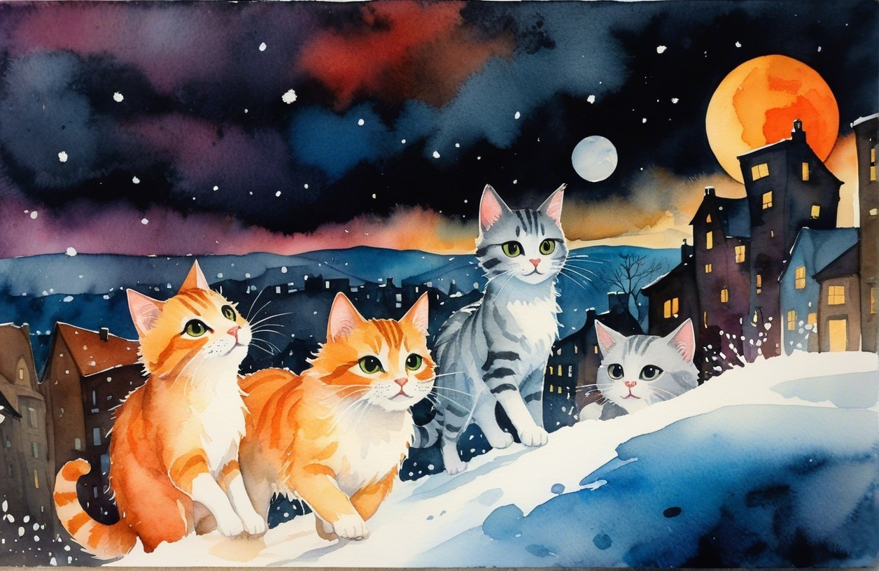 A whimsical watercolor scene featuring four cats wandering through a snowy landscape at night, under a full moon, with charming houses in the background and a colorful sky.