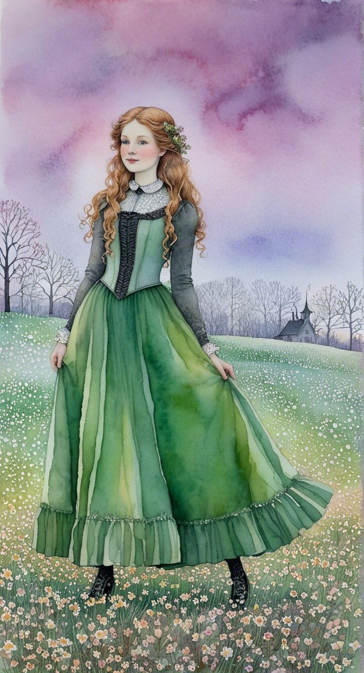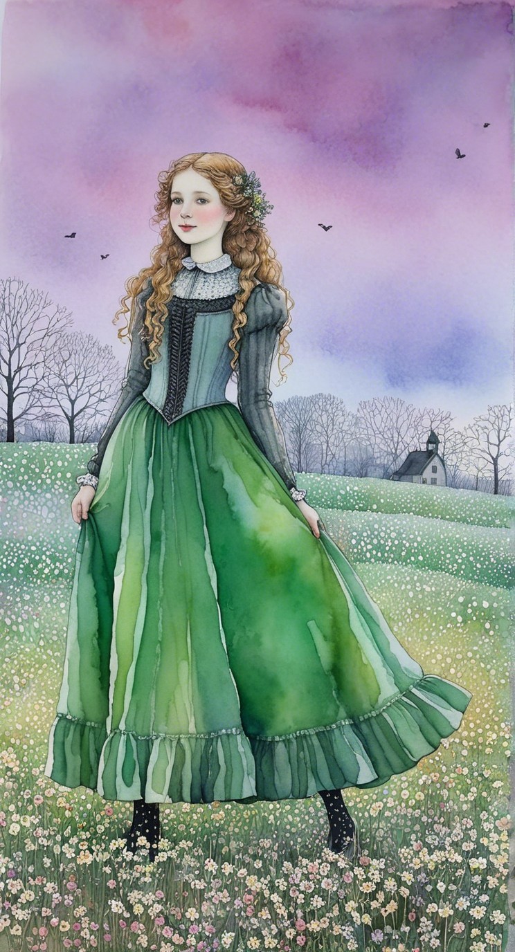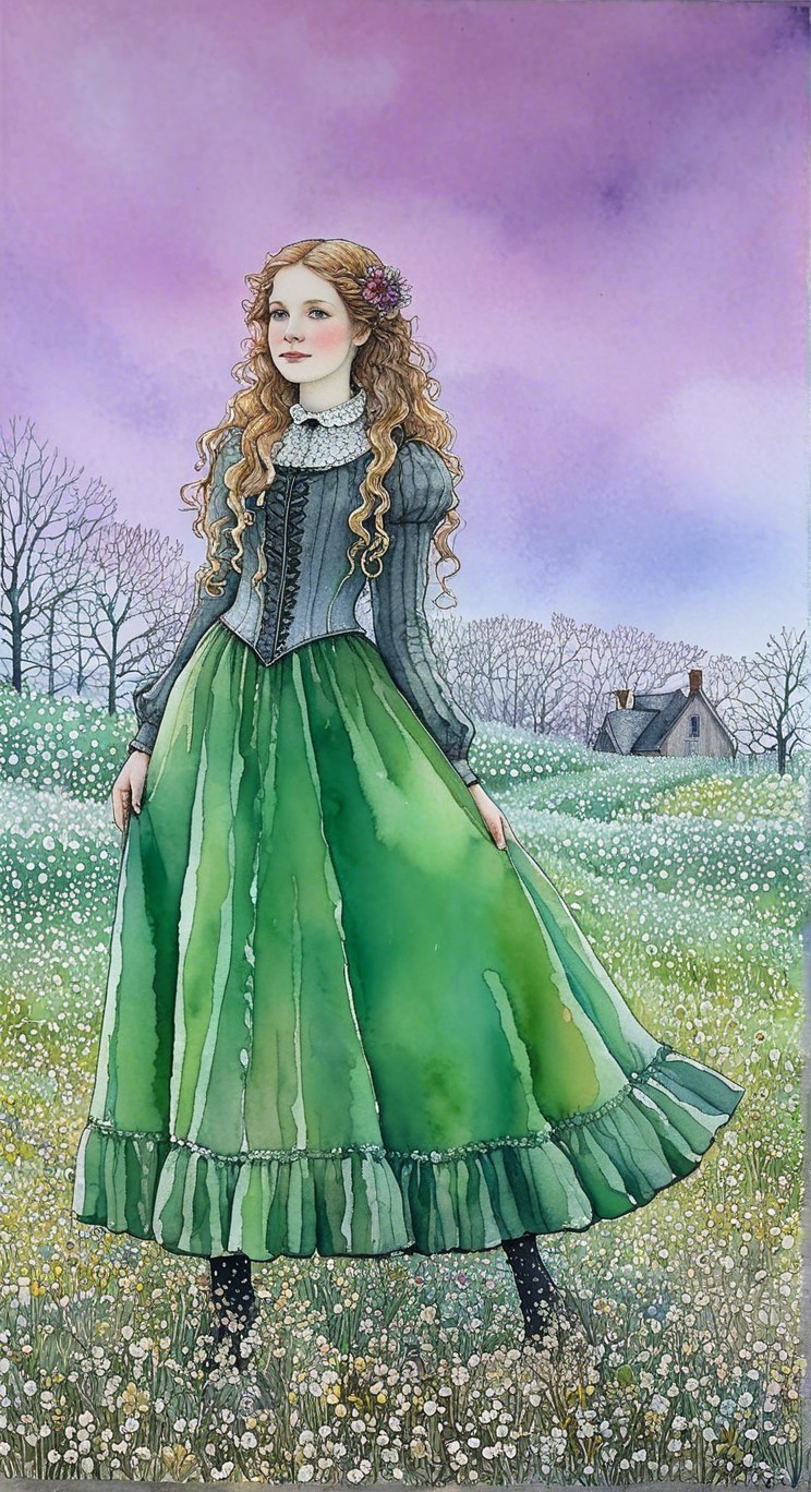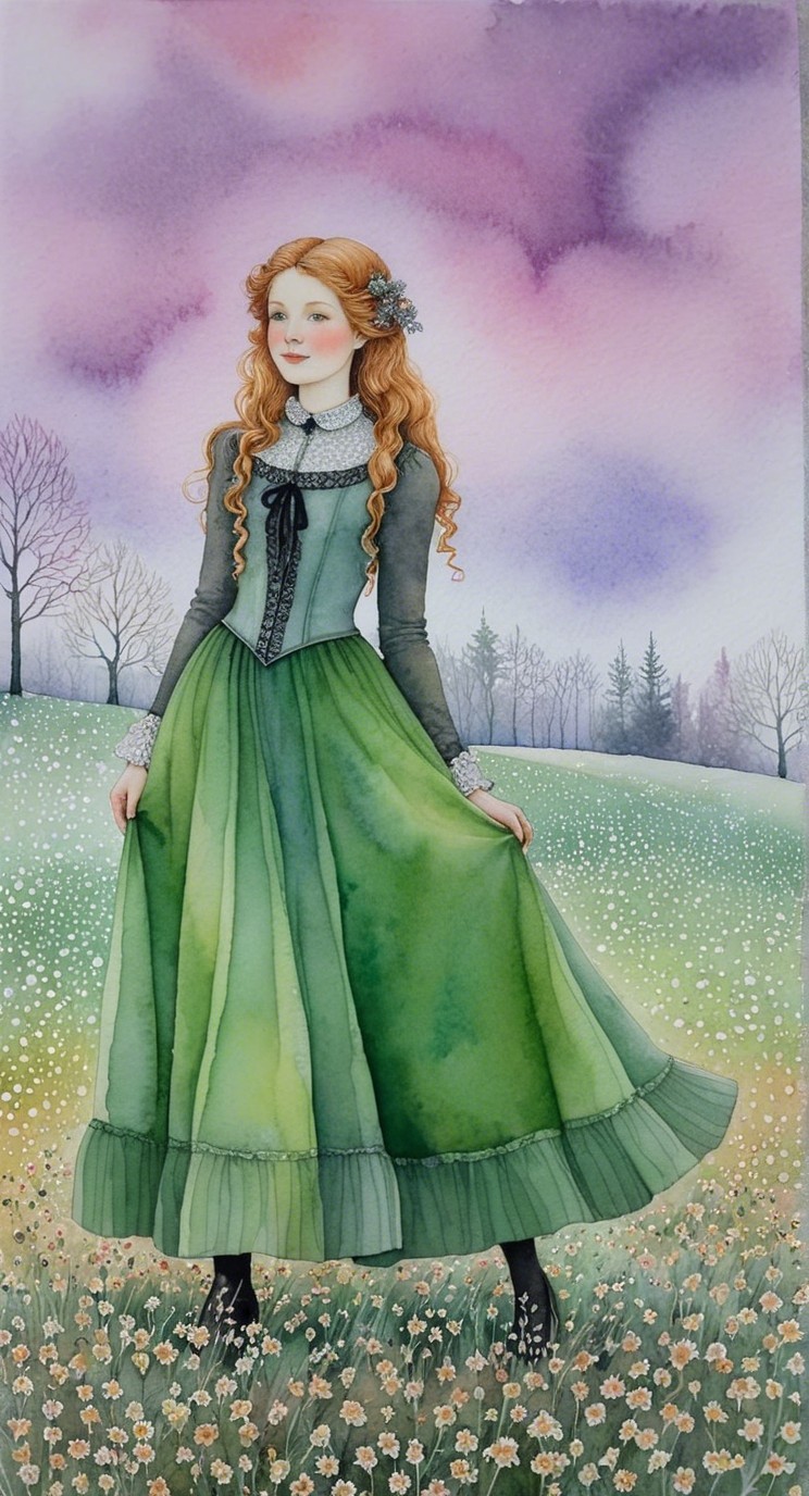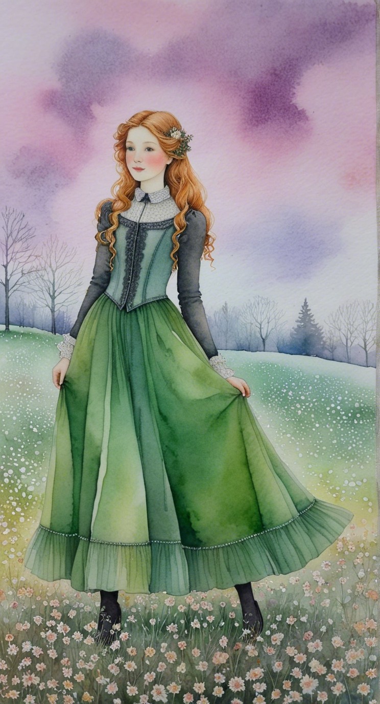A girl with flowing red hair wears a beautiful green dress, set against a dreamy pastel background of soft pinks and purples. She stands in a field of flowers, radiating serenity and grace.
