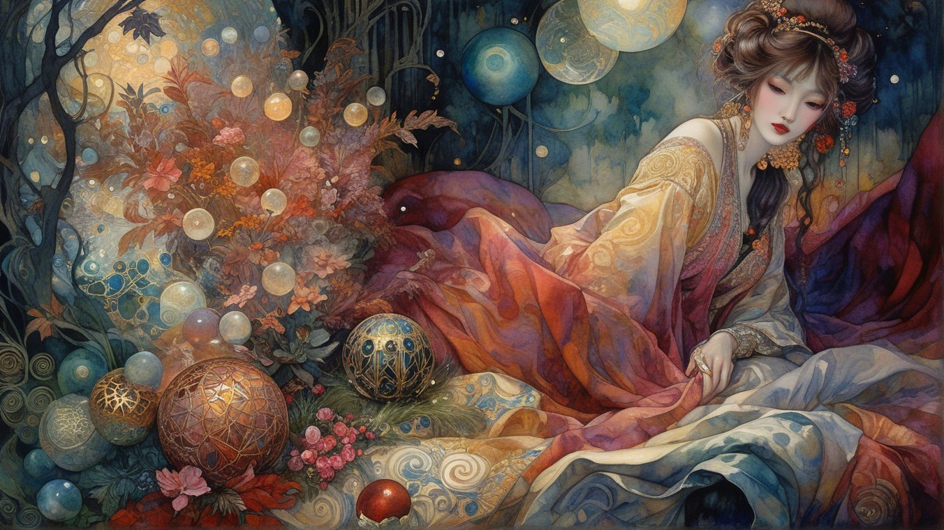 A serene woman in an ornate orange kimono sits among glowing orbs and lush foliage, set against a mystical backdrop of moons and dark woods, evoking a dreamlike atmosphere.