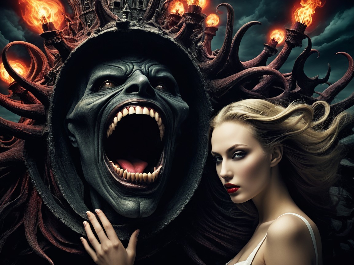A close-up shot of a blonde woman wearing a white dress, with her hand on the jaw of a screaming monster. The monster is gray, with a wrinkled face, sharp teeth, and a gaping mouth. It is surrounded by a halo of red antlers with flames on top. The background is