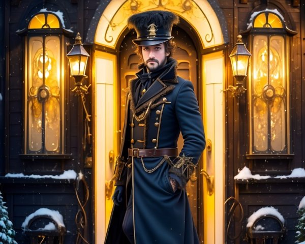 A striking figure with short red hair and a dramatic black outfit, adorned with steampunk elements and a high collar. The background features a smoky, industrial landscape, enhancing the mysterious vibe.