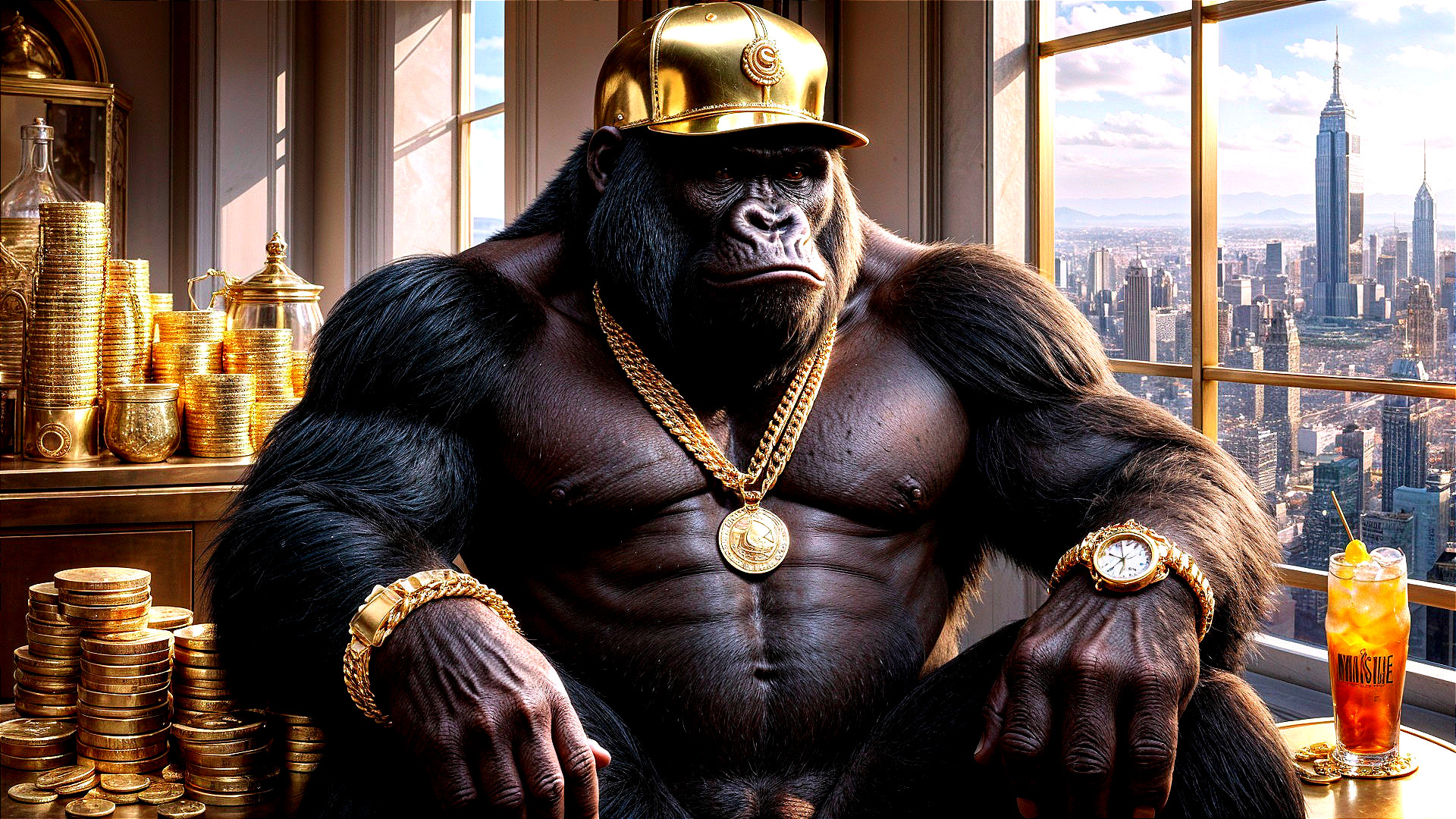 A muscular gorilla, wearing a gold cap and multiple gold chains, sits confidently amidst piles of coins, with a city skyline view and a drink beside him, exuding luxury and power.