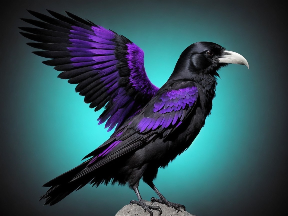 A majestic raven with glossy black feathers adorned in vibrant purple and blue hues. Its wings are spread wide, showcasing the colorful plumage against a glowing turquoise background.