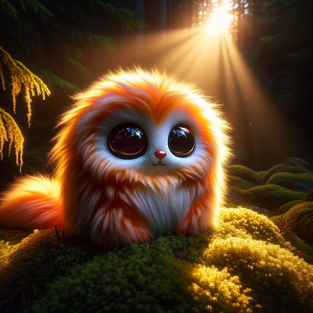 A cute, fluffy creature with large eyes sits on soft moss in a forest, illuminated by sun rays filtering through the trees. Its vibrant orange fur glows in the warm, magical light.