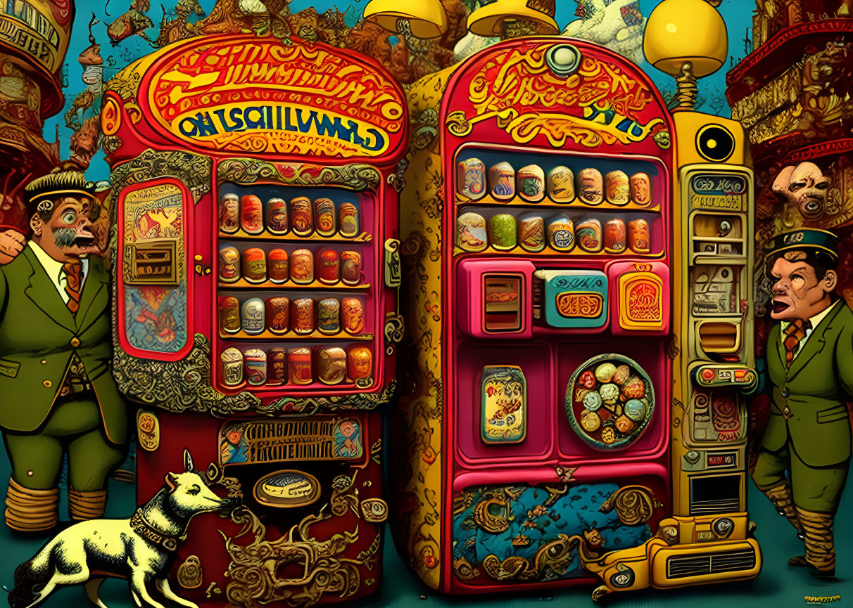 Vintage-Style Candy Vending Machines with Colorful Candies and Caricatured Faces