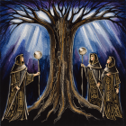 Three cloaked figures stand before a majestic, ancient tree, illuminated by ethereal light. Their robes feature intricate designs, and they hold orbs, suggesting a mysterious ritual or gathering.