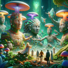 Two elegantly dressed women in vibrant green attire sit in a lush, stylized setting. A large, serene statue of a goddess looms behind them, complemented by colorful lanterns and tropical plants.