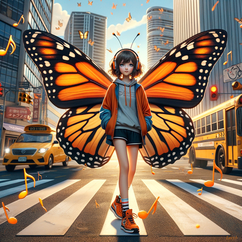 A girl with butterfly wings stands on a city crosswalk, wearing a hoodie and sporty shorts, surrounded by floating musical notes and vibrant buildings, creating a whimsical urban scene.