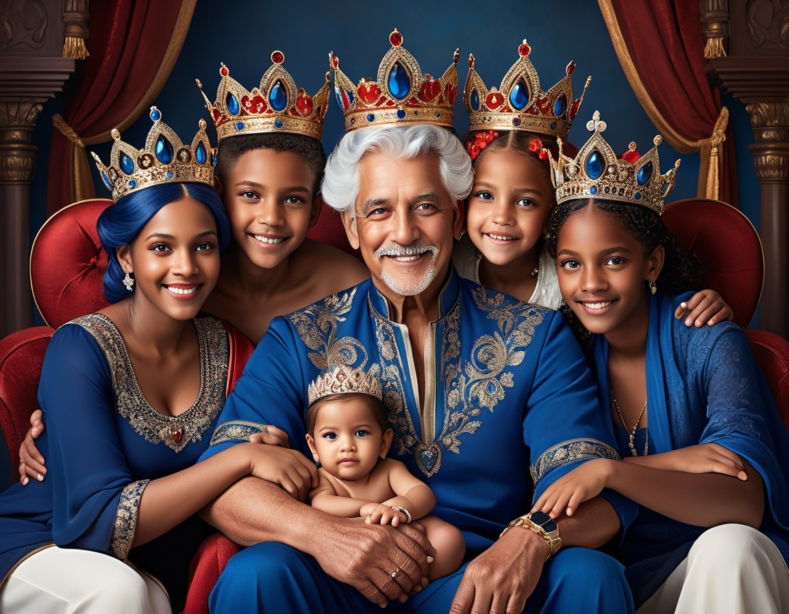 A regal family poses together, adorned in royal blue attire and embellished crowns. The joyful group includes an older man and five younger individuals, showcasing unity and warmth.