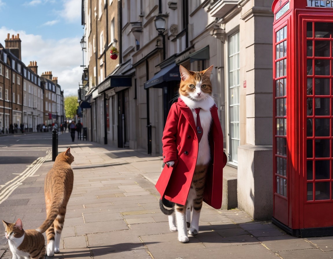 Two cats in a city street; one stands on hind legs wearing a coat and carrying a briefcase, the other on all fours.