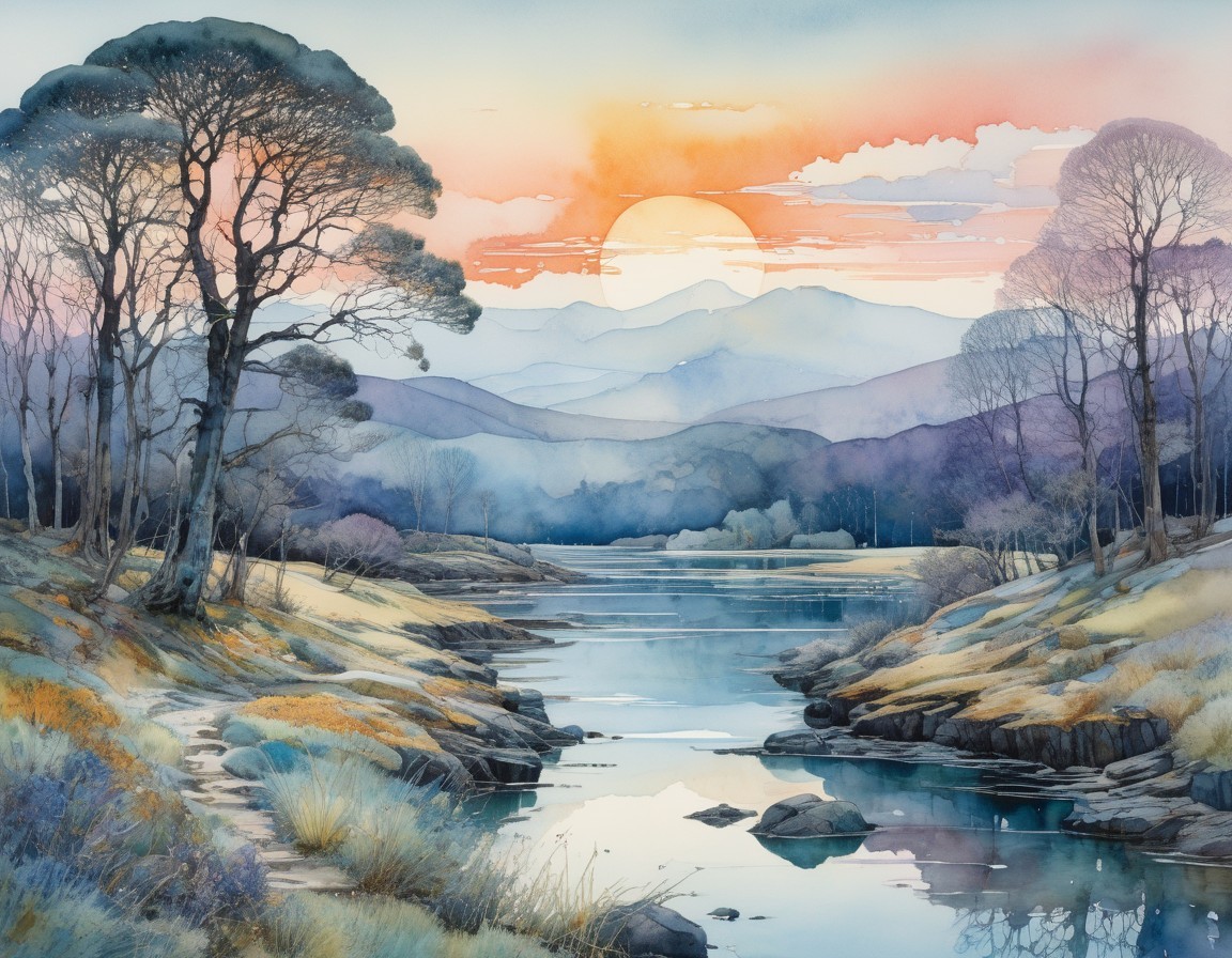 The past is pulling me back, beautiful lady. A breathtaking watercolor and ink masterpiece comes to life in a dreamlike landscape. The scene is a fusion of mesmerizing fantasy visions from Kiki Smith, Glenn Murcutt, Charles Rennie Mackintosh, Jamie Hayden, Henry Moret, Scott Naismith, Pierre Bonnard, Charles Maurice Detmold and William Timlin. The award-winning composition incorporates mixed media elements and 3D modeling adding depth of field, 32k, insanely complex detailed images.
