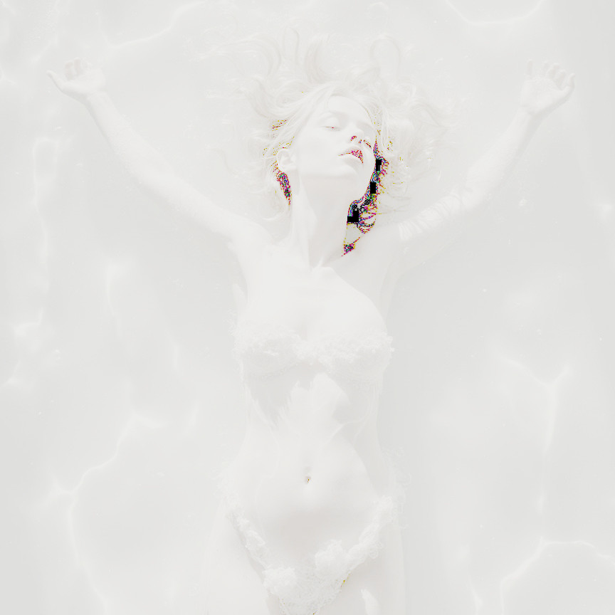 A figure lies peacefully in shallow water, surrounded by a soft white glow. Their long hair floats gently, and they wear delicate accessories that contrast with the ethereal atmosphere.