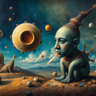 A surreal landscape features a humanoid figure with a curious expression, surrounded by planets and strange objects. Majestic domes rise in the background under a dramatic sky, creating a dreamlike atmosphere.