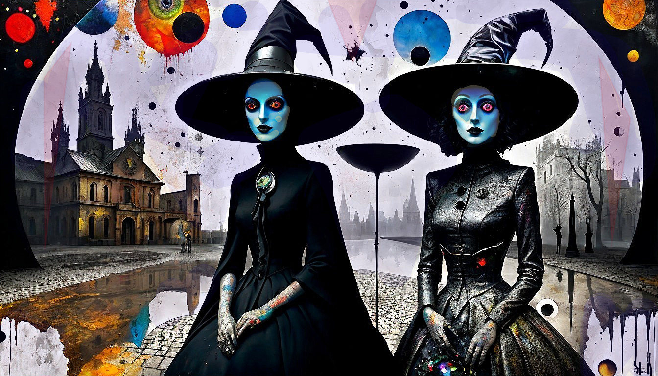 Artistic representation of two gothic figures dressed as witches with a stylized, whimsical cityscape and colorful cosmic elements in the background.