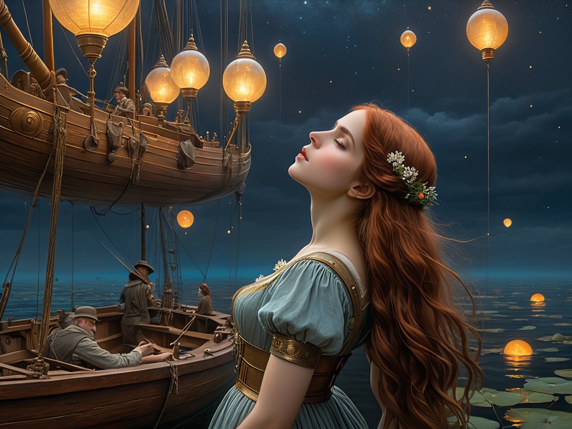 A young woman in an elegant blue dress gazes upward, adorned with flowers in her hair. She stands amidst a fantastical setting of glowing lanterns and a starry night sky.