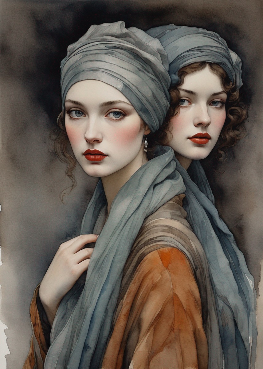 A vintage-style watercolor portrait of a woman with a blue turban, red lips, and a striped shawl.