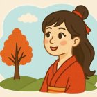 A cheerful Lego figure in traditional attire stands in a colorful landscape, with a vibrant orange tree and fluffy white clouds under a bright blue sky, evoking a whimsical, playful scene.