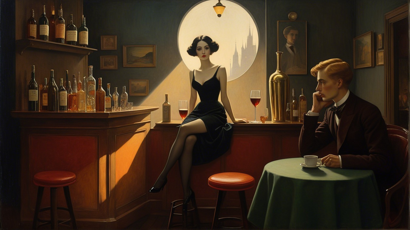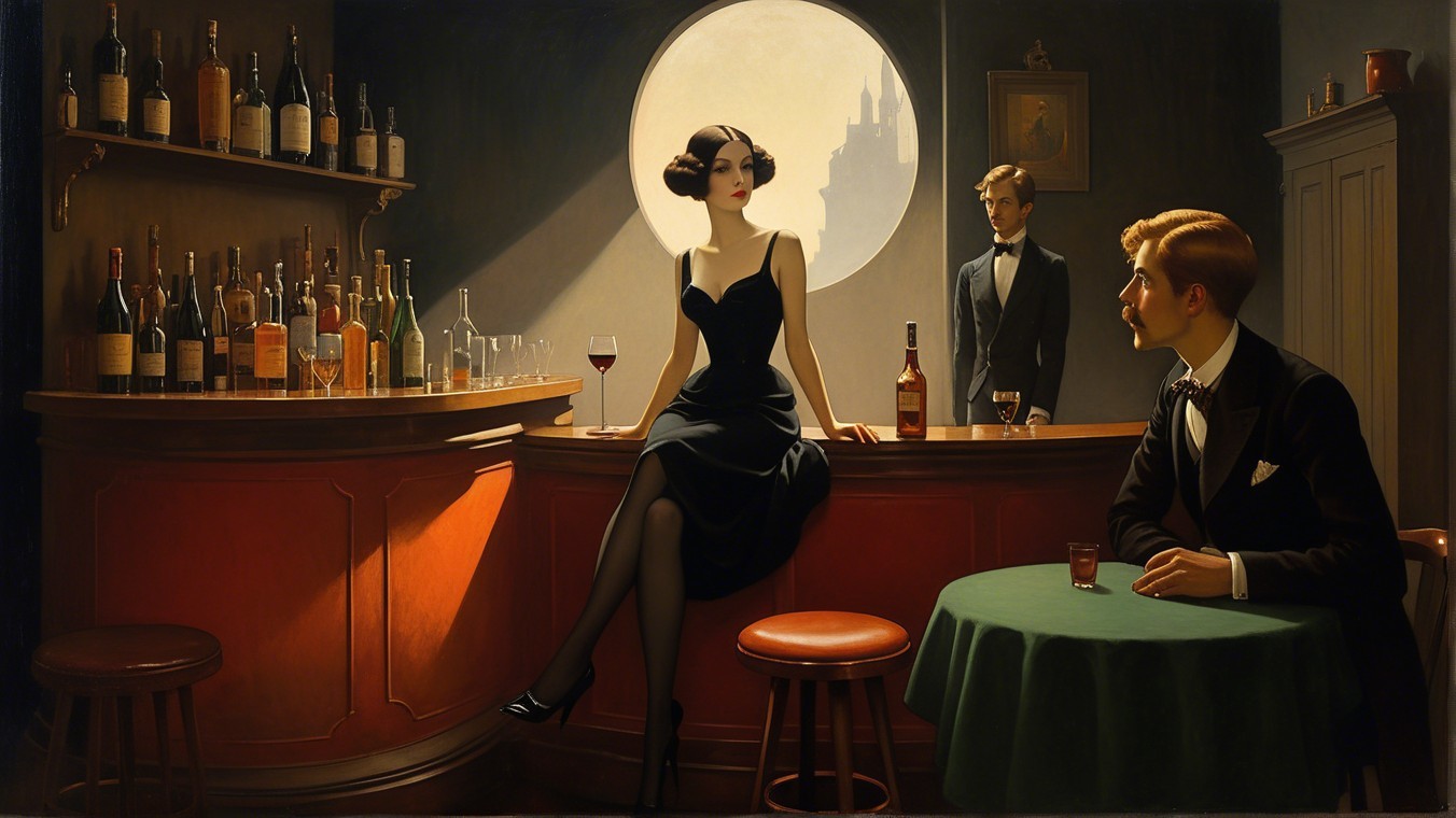 In a stylish bar, a woman in a sleek black dress sits gracefully beside a man in a suit. The warm ambiance features shelves lined with bottles, creating an elegant, nostalgic atmosphere.
