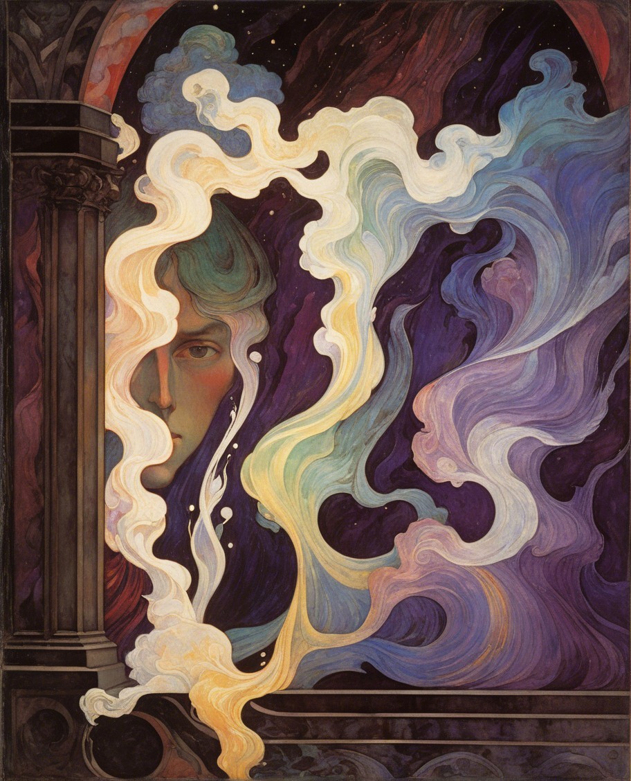 one full width color image, marbled portrait, style of Mikalojus Ciurlionis, style of Umberto Boccioni, style of Harry Clarke, 侘び寂び, flowing hints of silver blue green purple red gold deep mauve