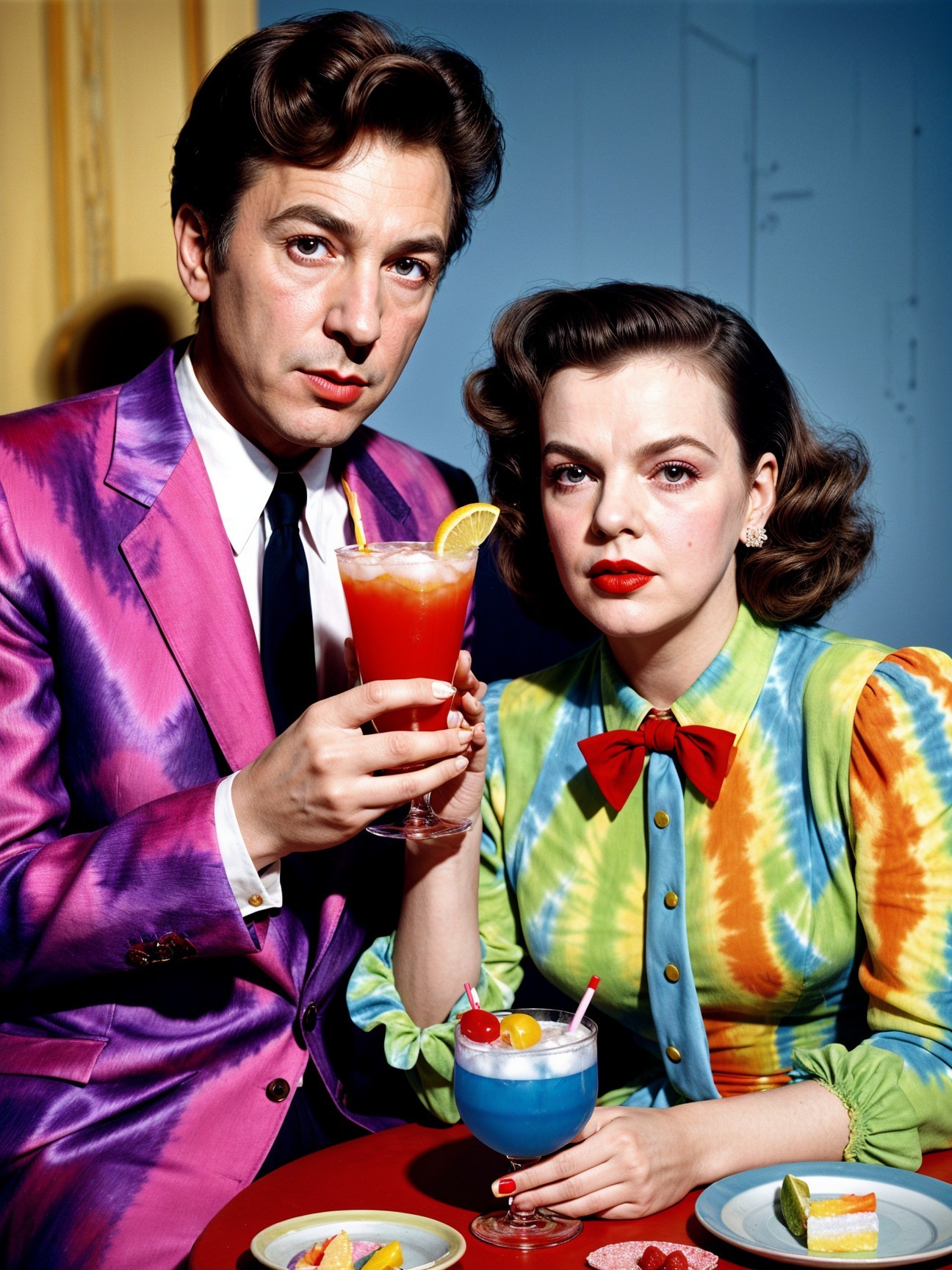 A stylish couple poses for a vibrant photo, with the man in a bold, colorful suit holding a drink, and the woman in a tie-dye dress, elegantly sipping a cocktail, both exuding vintage glamour.