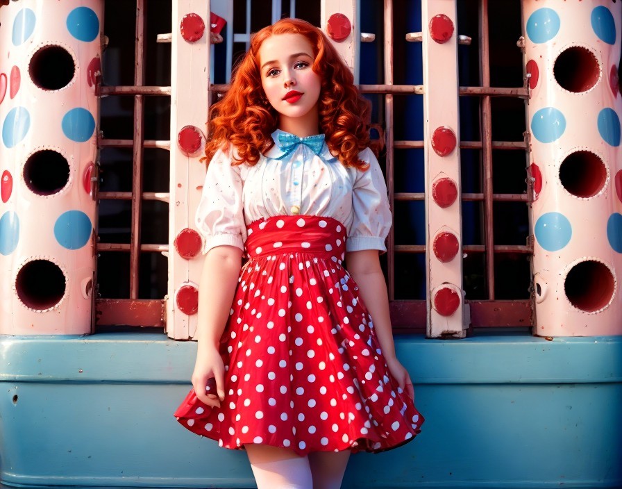 A woman in a vintage red polka dot dress with a blue bow tie stands before a patterned wall at golden hour.