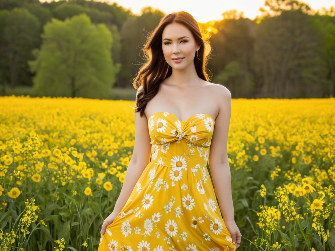 A young woman in a yellow dress stands amidst a vibrant field of yellow flowers. Her long, flowing hair catches the sunlight, creating a serene and picturesque atmosphere in nature.