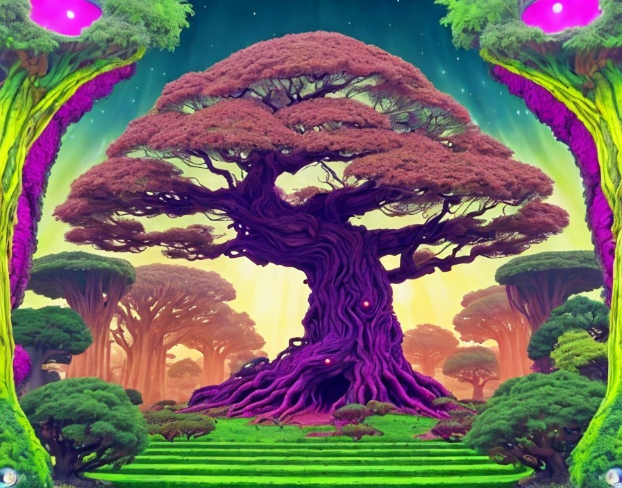 Prompt: Forested alien world with bonsai trees and sacred extraterrestrial palace. In the center of the scene, there is an intricate and mesmerizing wormhole/portal, swirling and glowing with energy. Through the portal, glimpses of strange and enigmatic DMT entities can be seen. These entities are composed of intricate patterns and radiant hues and seem to emanate a curious wisdom. Surrounding the portal, the surreal landscape is filled with floating celestial bodies, sacred geometry, and shimmering particles that hint at the mystical nature of this cosmic realm