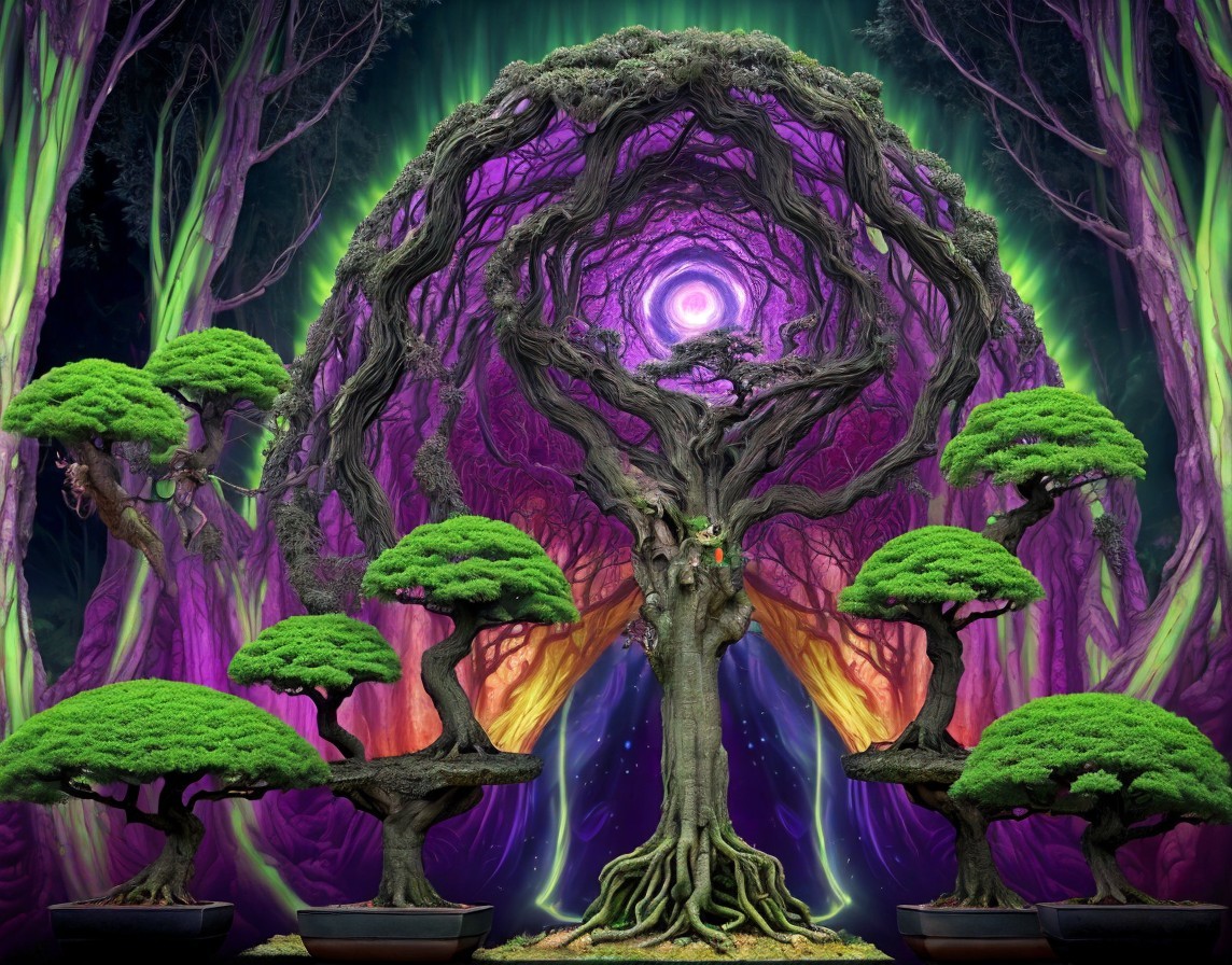Forested alien world with bonsai trees and sacred extraterrestrial palace. In the center of the scene, there is an intricate and mesmerizing wormhole/portal, swirling and glowing with energy. Through the portal, glimpses of strange and enigmatic DMT entities can be seen. These entities are composed of intricate patterns and radiant hues and seem to emanate a curious wisdom. Surrounding the portal, the surreal landscape is filled with floating celestial bodies, sacred geometry, and shimmering particles that hint at the mystical nature of this cosmic realm