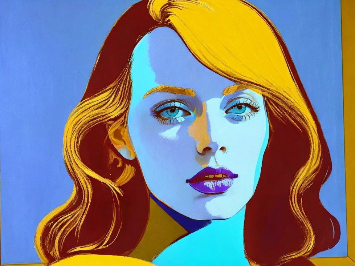 A stylized Pop Art portrait of a woman in blue light with vibrant yellow hair, blue eyes, and bold pink lips against a bright graphic background.