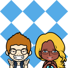 A cheerful couple enjoys ice cream together at a cozy setting, with vibrant colors. The man wears a blue shirt, while the woman holds a cupcake, smiling joyfully at the camera.