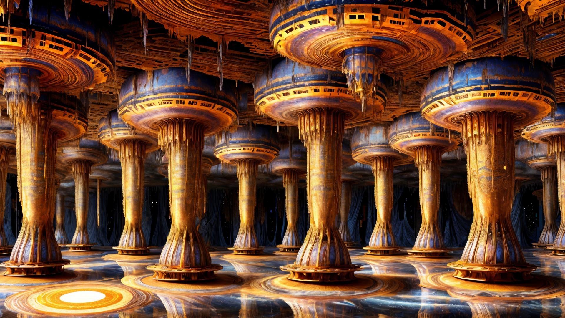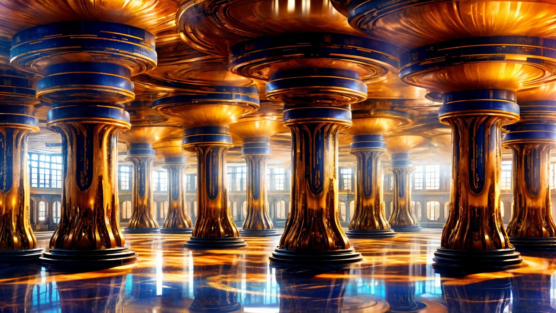 The grand interior features towering columns and intricate golden designs. Sunlight streams through large windows, illuminating the polished floor and creating an ethereal atmosphere.