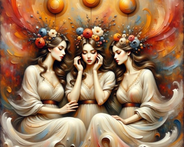 A surreal portrait of a woman with intricately detailed floral tattoos, surrounded by dramatic clouds and butterflies, set against a vibrant sunset backdrop. Her hair is adorned with blossoms.