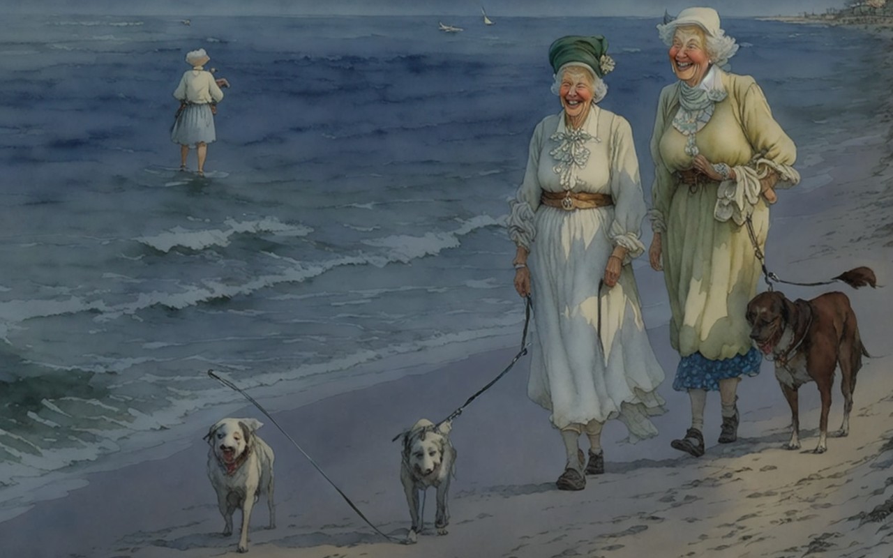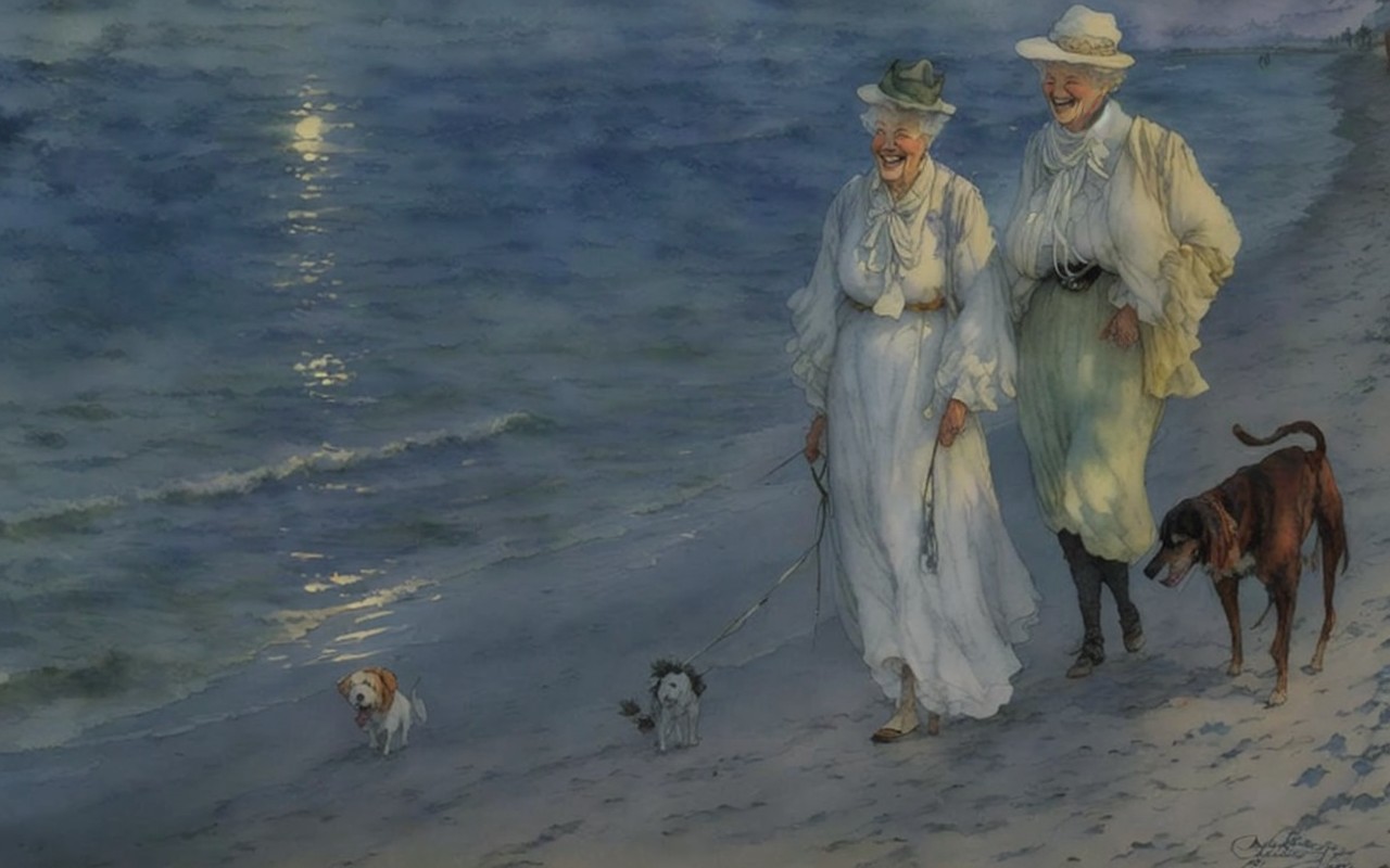 Two elderly women stroll along a beach, hand in hand, accompanied by a dog. They wear vintage attire and straw hats, with a sailboat visible in the calm sea under a cloudy sky.