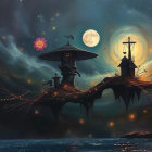 A mystical landscape features whimsical wooden structures on stilts, surrounded by ethereal flowers. A full moon glows brightly, casting a serene light over the dark, surreal waters below.