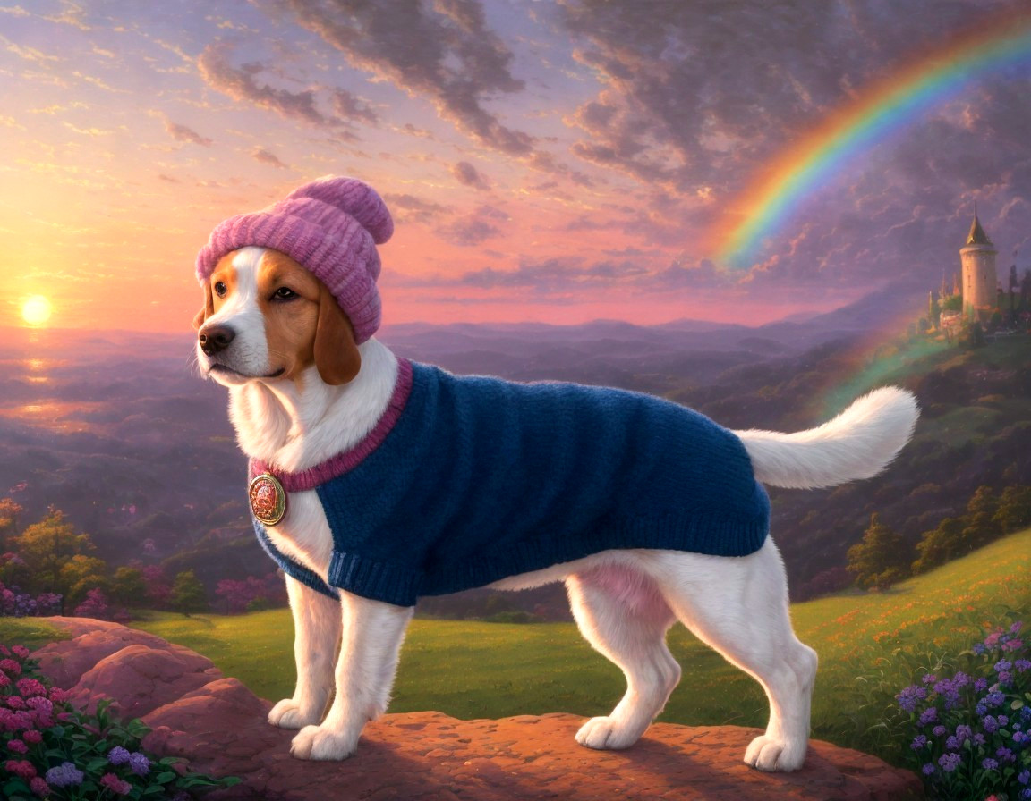 A beagle in a hat and sweater stands on a hill with a rainbow, flowers, and castle in a serene, colorful landscape at sunset.